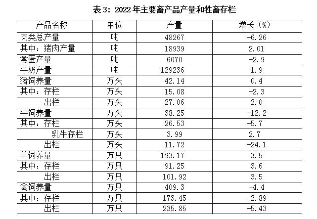 年末大牲畜存欄27.42萬頭,比上年下降6%。豬飼養(yǎng)量 42.14萬頭,比上年增長0.4%;牛飼養(yǎng)量38.25萬頭,比上年下降12.2%,其中,乳牛存欄3.99萬頭,比上年增長2.7%;羊飼養(yǎng)量193.17萬只,比上年增長3.5%;家禽飼養(yǎng)量409.3萬只,比上年下降4.4% 。豬出欄27.06萬頭,比上年增長2%;牛出欄11.72萬頭,比上年下降24.1%;羊出欄101.92萬只,比上年增長3.5%;家禽出欄235.85萬只,比上年下降5.43% 。全年肉產(chǎn)量48267噸,比上年下降6.26%;禽蛋產(chǎn)量6070噸,比上年下降2.9%;牛奶產(chǎn)量129236噸,比上年增長1.9%。