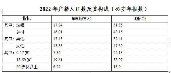 年末全市常住人口29.2萬人,同比增長(zhǎng)0.26%;戶籍人口33.2550萬人,同比下降0.19%,其中,城鎮(zhèn)人口17.2441萬人,占總?cè)丝诒戎貫?1.85%,比上年末下降0.1個(gè)百分點(diǎn)。全年出生人口1987人,出生率5.98‰,比上年下降1.22個(gè)千分點(diǎn);全年死亡人口1131人,死亡率3.4‰,比上年下降0.32個(gè)千分點(diǎn)。自然增長(zhǎng)率2.57‰,比上年下降0.9個(gè)千分點(diǎn)。
