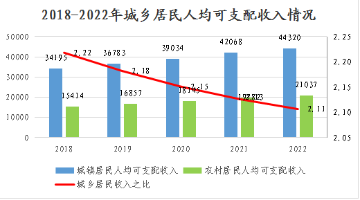 城鎮(zhèn)居民人均可支配收入44320元,增長(zhǎng)5.4%;農(nóng)村居民人均可支配收入21037元,增長(zhǎng)6.3%。