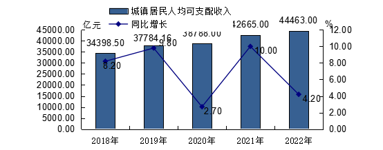 2022年,全體居民人均可支配收入達(dá)36440元,比上年增長5.5%。按地域分:城鎮(zhèn)居民人均可支配收入44463元,增長4.2%;農(nóng)村居民人均可支配收入23139元,增長8.5%。全體居民人均生活消費支出達(dá)25990元,增長5.2%。按地域分,城鎮(zhèn)居民人均生活消費支出31141元,增長4.3%,農(nóng)村居民人均生活消費支出17244元,同比增長7.0%。