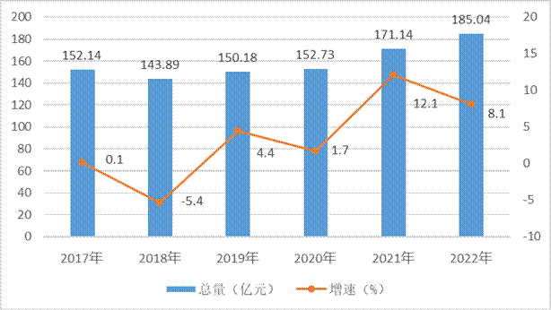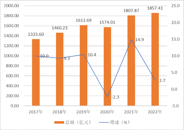 圖3? 2017-2022年全市社會(huì)消費(fèi)品零售及其增幅