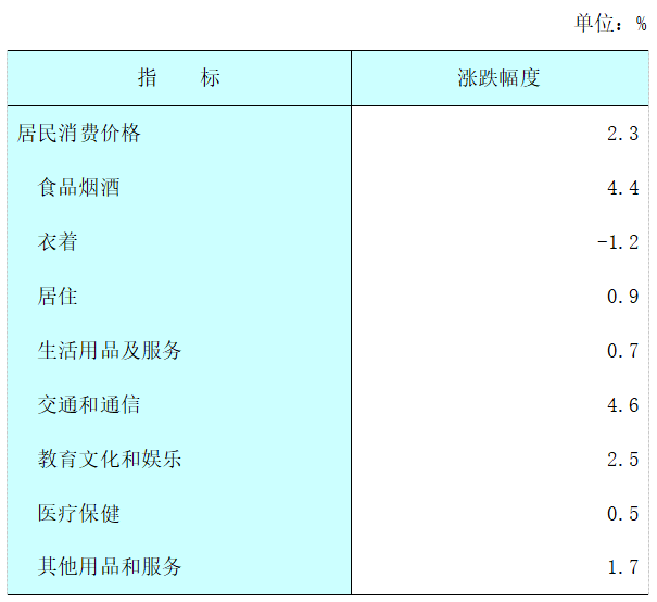 全年居民消費(fèi)價(jià)格比上年上漲2.3%,其中,食品煙酒類(lèi)價(jià)格上漲4.4%。