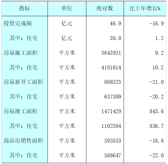 全年房地產(chǎn)開(kāi)發(fā)投資46.9億元,比上年下降16.9%。其中,住宅投資30.0億元,增長(zhǎng)1.2%;辦公樓投資0.2億元,增長(zhǎng)77%;商業(yè)營(yíng)業(yè)用房投資4.5億元,下降43.3%。