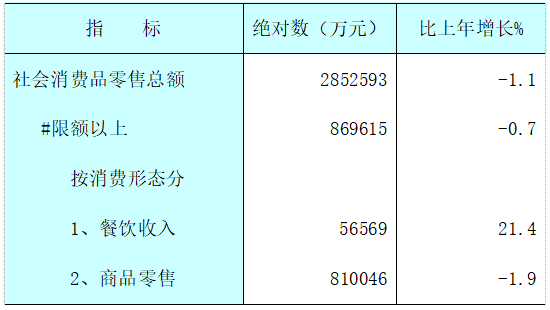 全年全區(qū)社會(huì)消費(fèi)品零售總額2852593萬(wàn)元,比上年下降1.1%。其中限額以上貿(mào)易企業(yè)(含個(gè)體戶)273家,實(shí)現(xiàn)社會(huì)消費(fèi)品零售總額869615萬(wàn)元,比上年下降0.7%。限上零售額按消費(fèi)類(lèi)型分,商品零售810046萬(wàn)元,下降1.9%,餐飲收入59569萬(wàn)元,增長(zhǎng)21.4%