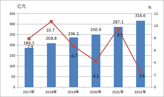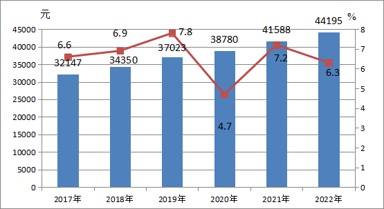 圖7 ?2017-2022年城鎮(zhèn)居民人均可支配收入及增長(zhǎng)速度