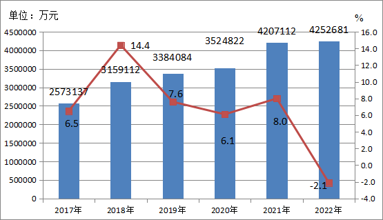 圖4??2017-2022年社會(huì)消費(fèi)品零售總額及增長(zhǎng)速度