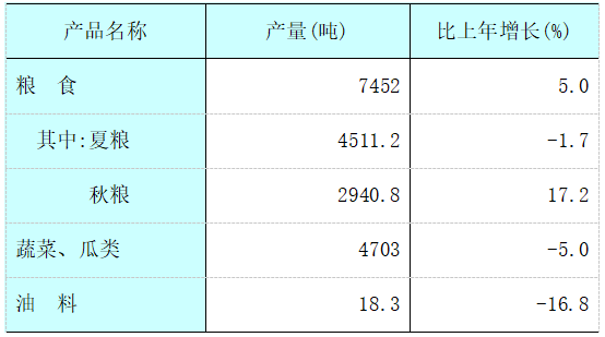 全年糧食總產(chǎn)量7452噸,比上年增加354.6噸,增產(chǎn)5.0%。其中,夏糧4511.2噸,減產(chǎn)1.7%;秋糧2940.8噸,增產(chǎn)17.2%。