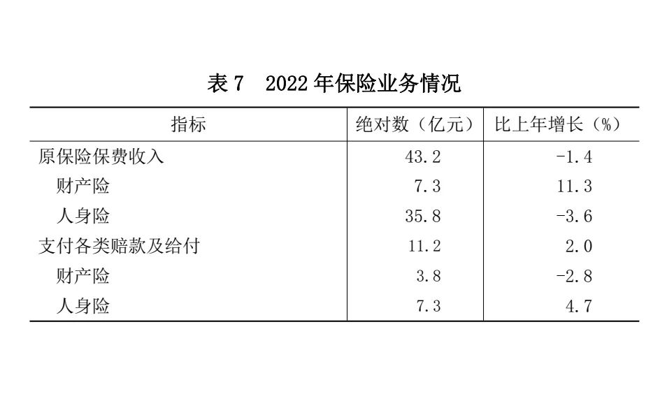 全年保險(xiǎn)公司原保險(xiǎn)保費(fèi)收入43.2億元,比上年下降1.4%;支付各類賠款及給付11.2億元,增長(zhǎng)2%。