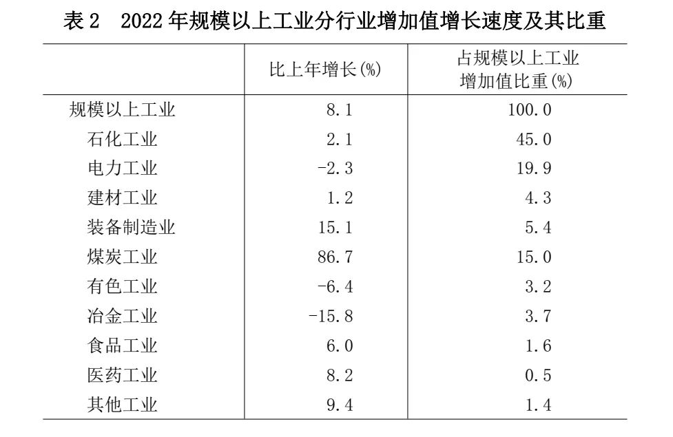 規(guī)模以上工業(yè)中,石化工業(yè)增加值增長(zhǎng)2.1%,電力工業(yè)下降2.3%,建材工業(yè)增長(zhǎng)1.2%,裝備制造業(yè)增長(zhǎng)15.1%,煤炭工業(yè)增長(zhǎng)86.7%,冶金工業(yè)下降15.8%,有色工業(yè)下降6.4%,食品工業(yè)增長(zhǎng)6%,醫(yī)藥工業(yè)增長(zhǎng)8.2%。戰(zhàn)略性新興產(chǎn)業(yè)增加值比上年下降18.3%,占規(guī)模以上工業(yè)增加值的比重為11.6%。風(fēng)光發(fā)電企業(yè)工業(yè)增加值下降15.3%,占規(guī)模以上工業(yè)增加值的比重為10%;風(fēng)光發(fā)電裝備制造企業(yè)工業(yè)增加值增長(zhǎng)25.1%,占規(guī)模以上工業(yè)增加值的比重為4.7%。