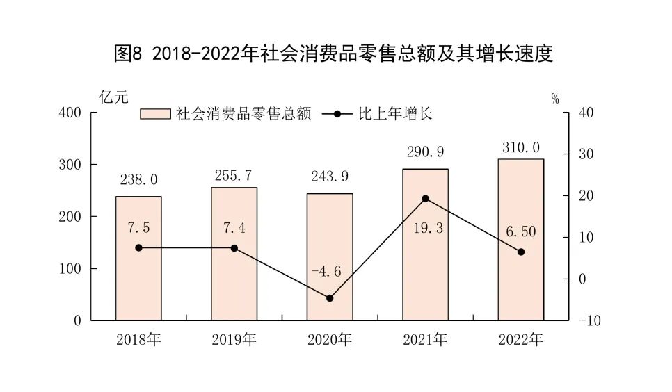 全年全市社會(huì)消費(fèi)品零售總額310億元,比上年增長(zhǎng)6.5%。按經(jīng)營(yíng)地統(tǒng)計(jì),城鎮(zhèn)消費(fèi)品零售額228.4億元,增長(zhǎng)5.7%;鄉(xiāng)村消費(fèi)品零售額81.6億元,增長(zhǎng)8.9%。按消費(fèi)形態(tài)統(tǒng)計(jì),商品零售額272.4億元,增長(zhǎng)6.4%;餐飲收入額37.5億元,增長(zhǎng)7.8%。