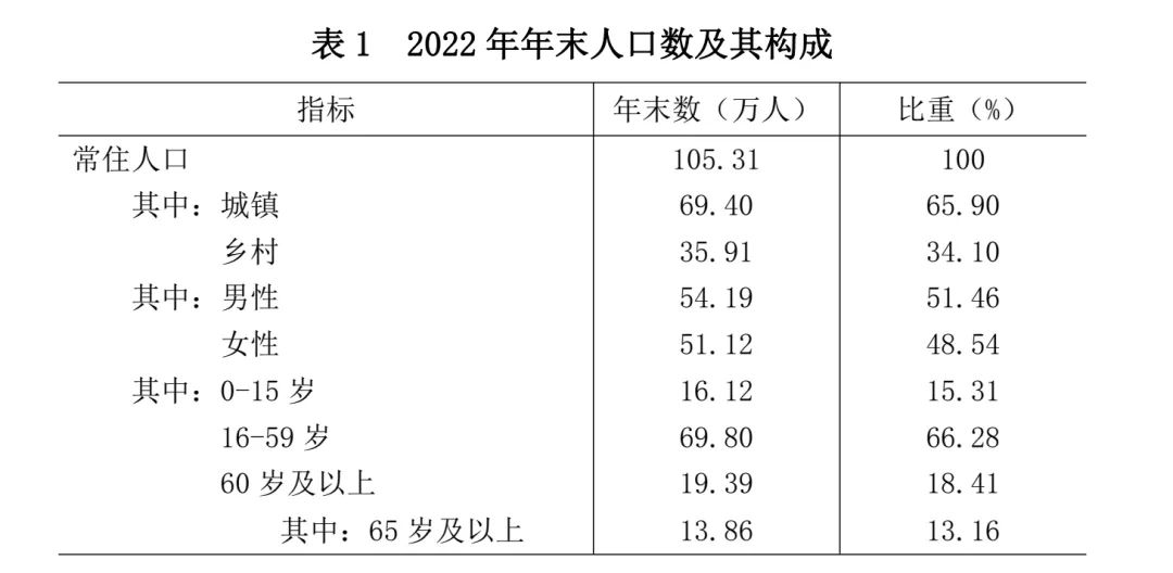 年末全市常住人口105.31萬(wàn)人,比上年末減少0.02萬(wàn)人。其中,城鎮(zhèn)人口69.4萬(wàn)人,占常住人口比重(常住人口城鎮(zhèn)化率)為65.9%,比上年末提高0.68個(gè)百分點(diǎn)。全年出生人口0.72萬(wàn)人,出生率為6.8‰;死亡人口0.82萬(wàn)人,死亡率為7.74‰;人口自然增長(zhǎng)率為-0.94‰。