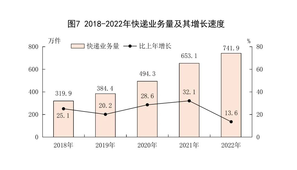 全年完成郵政行業(yè)業(yè)務(wù)總量2億元,比上年增長(zhǎng)5.7%;完成郵政業(yè)務(wù)收入2.8億元,增長(zhǎng)10.3%。郵政業(yè)全年完成郵政函件業(yè)務(wù)34.6萬(wàn)件,包裹業(yè)務(wù)1.4萬(wàn)件;快遞業(yè)務(wù)量741.9萬(wàn)件,增長(zhǎng)13.6%;快遞業(yè)務(wù)收入1.9億元,增長(zhǎng)9.2%。