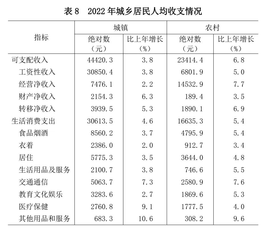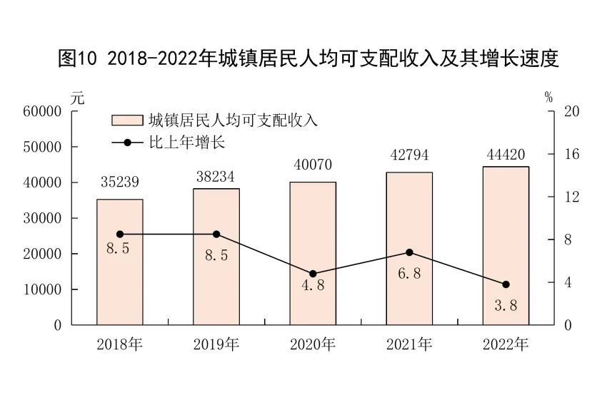 全年全市城鎮(zhèn)居民人均可支配收入44420元,比上年增長(zhǎng)3.8%;農(nóng)村居民人均可支配收入23414元,比上年增長(zhǎng)6.8%。城鄉(xiāng)居民人均可支配收入比值為1.9,比上年縮小0.05。