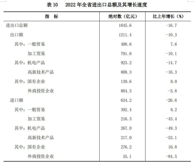 全年全省進出口總額1845.6億元,比上年下降16.7%。其中,進口額634.2億元,下降26.6%;出口額1211.4億元,下降10.3%。