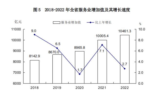 全年全省服務業(yè)增加值10461.34億元,按不變價格計算,比上年增長2.7%。其中,批發(fā)和零售業(yè)增加值1666.71億元,下降2.5%;交通運輸、倉儲和郵政業(yè)增加值1198.53億元,下降2.1%;住宿和餐飲業(yè)增加值213.78億元,下降2.0%;金融業(yè)增加值1359.02億元,增長5.9%;房地產(chǎn)業(yè)增加值1165.50億元,下降4.5%;信息傳輸、軟件和信息技術服務業(yè)增加值548.61億元,增長8.7%;租賃和商務服務業(yè)增加值322.74億元,增長6.1%。全年規(guī)模以上服務業(yè)企業(yè)營業(yè)收入增長6.5%。