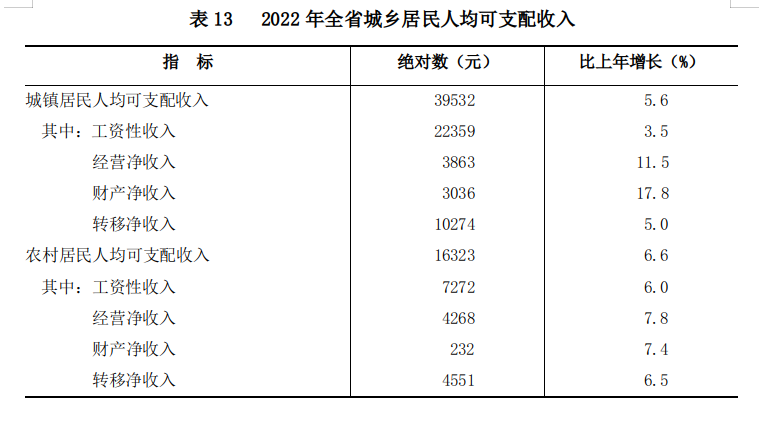 全年全省居民人均可支配收入29178元,比上年增長6.4%;居民人均消費支出17537元,增長2.0%。按常住地分,城鎮(zhèn)居民人均可支配收入39532元,增長5.6%,城鎮(zhèn)居民人均消費支出21923元,下降0.2%;農(nóng)村居民人均可支配收入16323元,增長6.6%,農(nóng)村居民人均消費支出12091元,增長6.0%。