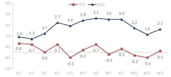 圖1? 2022年寧波市區(qū)居民消費(fèi)價(jià)格月度漲跌幅度(單位:%)