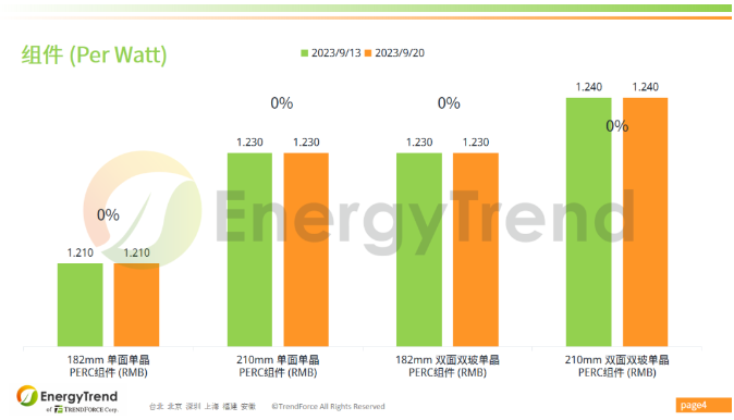 182mm 單面單晶PERC組件價格為 RMB1.21/W;210mm 單面單晶PERC組件報價保持在 RMB1.23/W;182mm 雙面雙玻單晶PERC組件最新報價為 RMB1.23/W;210mm 雙面雙玻單晶PERC組件價格為 RMB1.24/W。