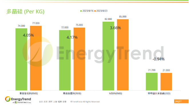 根據(jù)集邦咨詢旗下新能源研究中心集邦新能源網(wǎng)(EnergyTrend)2023年8月23日的報價,單晶復投料人民幣價格為 RMB77/KG,漲幅為 4.05%;單晶致密料人民幣最新價格上漲至 RMB75/KG,變動幅度為 4.17%。N型料人民幣報價上漲了 3.66%,最新價格為 RMB85/KG。非中國區(qū)多晶硅料美金價格為 US$21/KG,小幅波動。大牛工程師