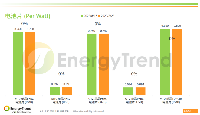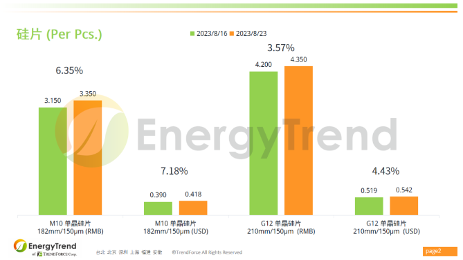 M10單晶硅片人民幣報價從 RMB3.15/Pc 上漲至 RMB3.35/Pc,漲幅為 6.35%;美金最新報價為 US$0.418/Pc,增長幅度為 7.18%。G12單晶硅片人民幣報價為 RMB4.35/P,增幅達到 3.57%;美金報價上漲了 4.43%,最新價格為 US$0.542/Pc。光伏產業(yè)供應鏈價格報告(2023.8.29)