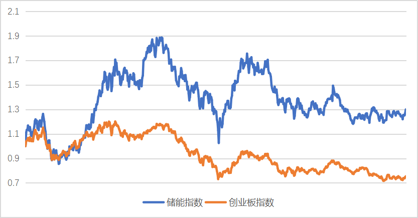 圖2-同期儲(chǔ)能指數(shù)與創(chuàng)業(yè)板指數(shù)的對(duì)比