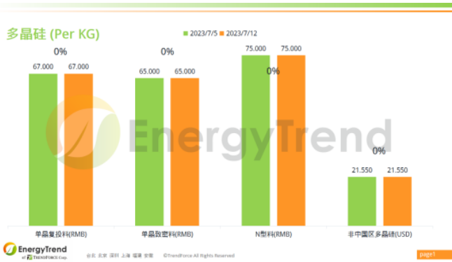 根據(jù)集邦咨詢旗下新能源研究中心集邦新能源網(wǎng)(EnergyTrend)2023年7月12日的報(bào)價(jià),單晶復(fù)投料人民幣價(jià)格保持在 RMB67/KG;單晶致密料人民幣最新價(jià)格為 RMB65/KG。N型料人民幣報(bào)價(jià)為 RMB75/KG。非中國(guó)區(qū)多晶硅料美金價(jià)格為 US$21.55/KG。