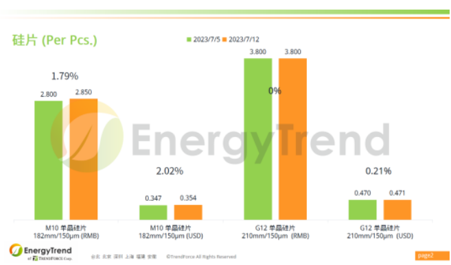M10單晶硅片人民幣報(bào)價(jià)掉落至 RMB2.85/Pc,漲幅為 1.79%;美金最新報(bào)價(jià)為 US$0.354/Pc,增長(zhǎng)了 2.02%。G12單晶硅片人民幣最新報(bào)價(jià)保持在 RMB3.8/Pc;美金報(bào)價(jià)為 US$0.471/Pc,小幅變動(dòng) 0.21%。