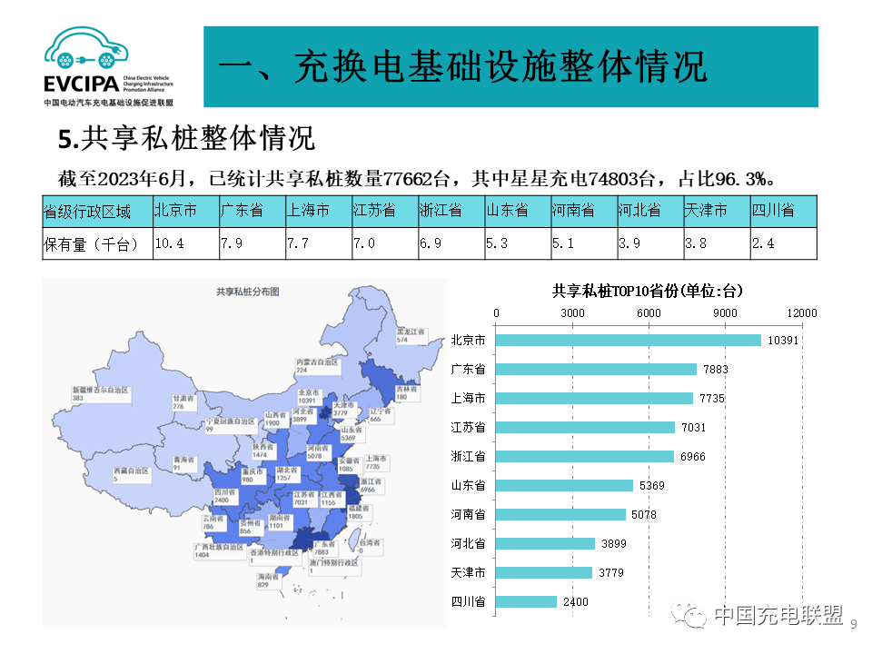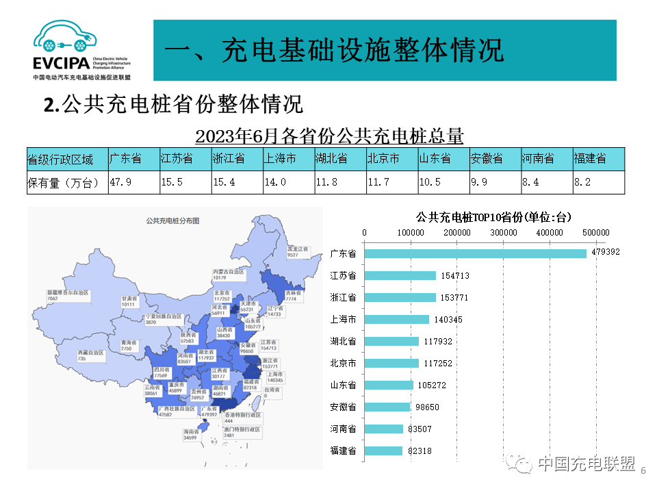 4 充電基礎設施整體運行情況,2023年1-6月,充電基礎設施增量為144.2萬臺,其中公共充電樁增量為35.1萬臺,隨車配建私人充電樁增量為109.1,同比上升18.6%。截止2023年6月,全國充電基礎設施累計數(shù)量為665.2萬臺,同比增加69.8%。25個省份公共樁保有量超過1萬臺,充電服務網點密度持續(xù)健全豐富。