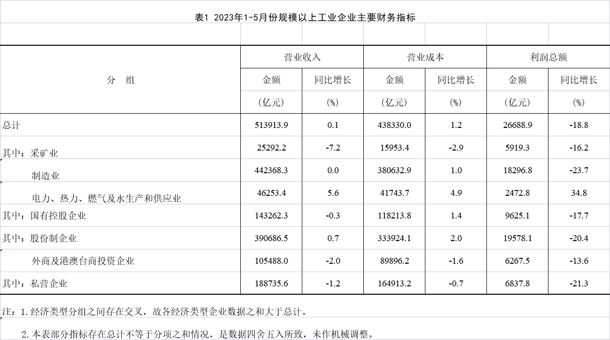 1—5月份,全國(guó)規(guī)模以上工業(yè)企業(yè)實(shí)現(xiàn)利潤(rùn)總額26688.9億元,同比下降18.8%,降幅比1—4月份收窄1.8個(gè)百分點(diǎn)(按可比口徑計(jì)算,詳見(jiàn)附注二)。