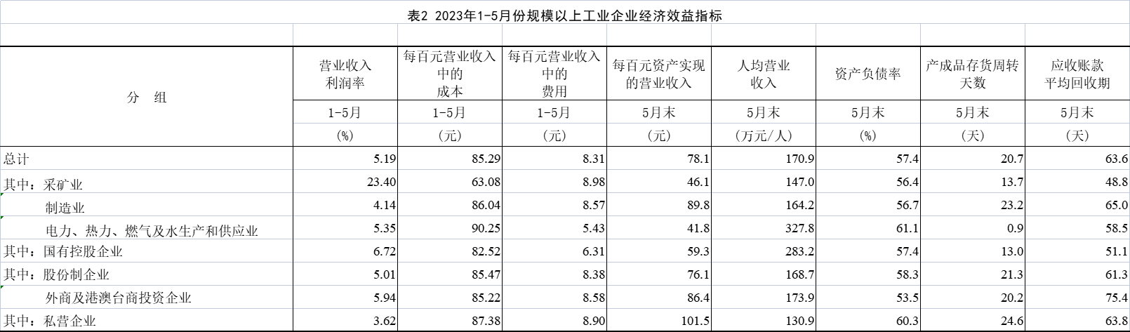 5月末,規(guī)模以上工業(yè)企業(yè)每百元資產(chǎn)實(shí)現(xiàn)的營(yíng)業(yè)收入為78.1元,同比減少5.8元;人均營(yíng)業(yè)收入為170.9萬(wàn)元,同比增加5.8萬(wàn)元;產(chǎn)成品存貨周轉(zhuǎn)天數(shù)為20.7天,同比增加1.0天;應(yīng)收賬款平均回收期為63.6天,同比增加6.4天。
