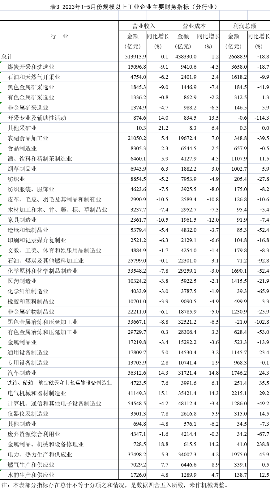 1—5月份,在41個(gè)工業(yè)大類行業(yè)中,14個(gè)行業(yè)利潤(rùn)總額同比增長(zhǎng),1個(gè)行業(yè)持平,24個(gè)行業(yè)下降,2個(gè)行業(yè)由盈轉(zhuǎn)虧。主要行業(yè)利潤(rùn)情況如下:電力、熱力生產(chǎn)和供應(yīng)業(yè)利潤(rùn)總額同比增長(zhǎng)45.9%,電氣機(jī)械和器材制造業(yè)增長(zhǎng)29.2%,汽車制造業(yè)增長(zhǎng)24.3%,通用設(shè)備制造業(yè)增長(zhǎng)23.4%,專用設(shè)備制造業(yè)下降0.1%,石油和天然氣開(kāi)采業(yè)下降9.9%,煤炭開(kāi)采和洗選業(yè)下降18.7%,非金屬礦物制品業(yè)下降25.9%,紡織業(yè)下降27.8%,農(nóng)副食品加工業(yè)下降39.5%,計(jì)算機(jī)、通信和其他電子設(shè)備制造業(yè)下降49.2%,化學(xué)原料和化學(xué)制品制造業(yè)下降52.4%,有色金屬冶煉和壓延加工業(yè)下降53.0%,石油、煤炭及其他燃料加工業(yè)下降92.8%,黑色金屬冶煉和壓延加工業(yè)由盈利轉(zhuǎn)為虧損。