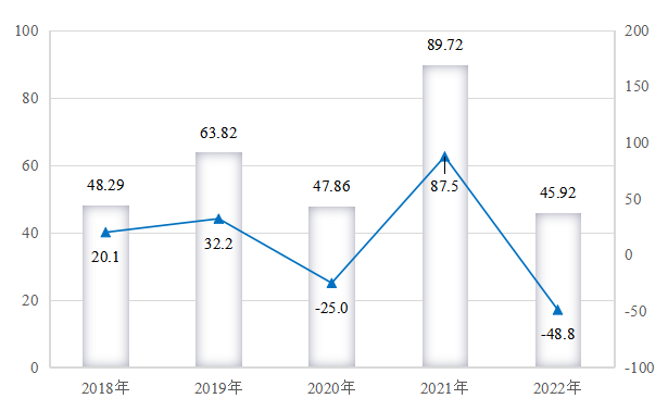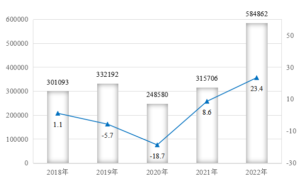 圖5:2018年-2022年社會消費(fèi)品零售總額及增長速度(單位:萬元、%)