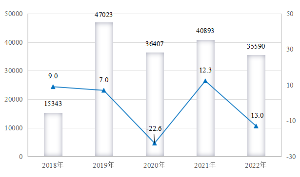 圖13:2018年-2022年規(guī)上工業(yè)綜合能源消費(fèi)量及增長速度(萬噸標(biāo)準(zhǔn)煤、%)