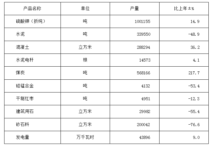 全年主要(規(guī)上)工業(yè)品:硫酸鉀1001155噸(折純后),同比增長14.9%;水泥339550噸,同比下降48.9%;混凝土288294立方米,同比增長36.2%;水泥電桿14573根,同比增長4.1%;煤炭568166噸,同比增長217.7%;硅錳合金4132噸,同比下降53.4%;干制紅棗4951噸,同比下降12.3%;建筑用石29982立方米,同比下降55.4%;砂石料200042立方米,同比下降76.6%;發(fā)電43896萬千瓦時,同比增長9.0%。
