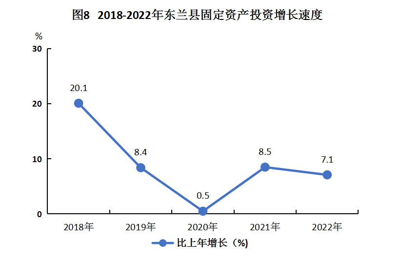 全年全縣固定資產(chǎn)投資比上年增長7.1%。其中,第一產(chǎn)業(yè)投資增長46.0%;第二產(chǎn)業(yè)投資下降9.7%,其中工業(yè)投資增長9.7%;第三產(chǎn)業(yè)投資增長9.2%?;A設施投資[8]下降89.2%。民間固定資產(chǎn)投資[9]增長18.1%。