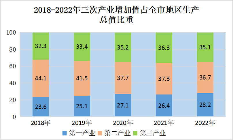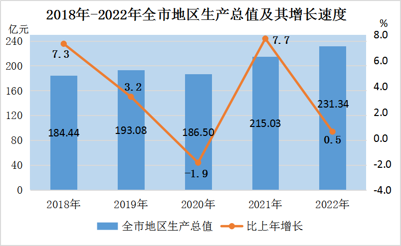 根據地區(qū)生產總值統(tǒng)一核算,2022年全市實現地區(qū)生產總值231.34億元,按不變價格計算(下同),比上年增長0.5%。其中,第一產業(yè)增加值65.26億元,比上年增長5.0%;第二產業(yè)增加值84.98億元,比上年下降2.6%;第三產業(yè)增加值81.10億元,比上年增長0.4%。三次結構調整為28.2:36.7:35.1,第一產業(yè)、第二產業(yè)增加值比重較上年分別提高1.7和1.0個百分點,第三產業(yè)增加值比重較上年下降2.7個百分點。三次產業(yè)分別拉動GDP增長1.3、-0.9、0.1個百分點。全年人均地區(qū)生產總值51238元,比上年下降0.2%;全市萬元地區(qū)生產總值能耗比上年增長10.2%。