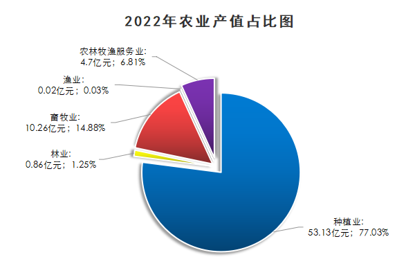全年農(nóng)業(yè)總產(chǎn)值完成68.97億元,其中:種植業(yè)產(chǎn)值完成53.13億元,占農(nóng)林牧漁業(yè)總產(chǎn)值的77.03%;林業(yè)產(chǎn)值完成0.86億元,占農(nóng)林牧漁業(yè)總產(chǎn)值的1.25%;畜牧業(yè)產(chǎn)值完成10.26億元,占農(nóng)林牧漁業(yè)總產(chǎn)值的14.88%;漁業(yè)產(chǎn)值完成0.02億元,占農(nóng)林牧漁業(yè)總產(chǎn)值的0.03%;農(nóng)林牧漁服務(wù)業(yè)產(chǎn)值完成4.7億元,占農(nóng)林牧漁業(yè)總產(chǎn)值的6.81%。