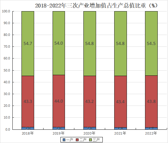 初步核算,全年地區(qū)生產(chǎn)總值3772613萬(wàn)元,比上年增長(zhǎng)5.0%。其中,第一產(chǎn)業(yè)增加值62157萬(wàn)元,增長(zhǎng)4.4%;第二產(chǎn)業(yè)增加值1652922萬(wàn)元,增長(zhǎng)6.5%;第三產(chǎn)業(yè)增加值2057534萬(wàn)元,增長(zhǎng)3.8%。三次產(chǎn)業(yè)結(jié)構(gòu)由上年的1.8:43.4:54.8調(diào)整為1.7:43.8:54.5,三次產(chǎn)業(yè)對(duì)GDP增長(zhǎng)的貢獻(xiàn)率分別為1.7%、55.9%和42.4%,分別拉動(dòng)地區(qū)生產(chǎn)總值增長(zhǎng)0.09、2.77和2.10個(gè)百分點(diǎn)。