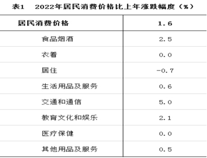 ??全年居民消費(fèi)價(jià)格(CPI)同比上漲1.6%。分類別看,交通和通信價(jià)格上漲5.0%,居八大類之首;其次是食品煙酒上漲2.5%。各行業(yè)消費(fèi)價(jià)格情況詳見表1。