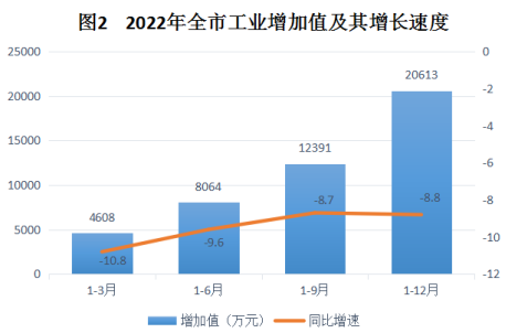 全年全市工業(yè)增加值20613萬元,同比下降8.8%;其中,規(guī)模以上工業(yè)增加值同比下降14.6%。