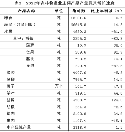 全年全市農(nóng)林牧漁業(yè)增加值83930萬元,同比增長3.0%。農(nóng)林牧漁業(yè)總產(chǎn)值138822萬元,同比增長3.2%。從內(nèi)部行業(yè)看,種植業(yè)產(chǎn)值102326萬元,同比增長16.1%。糧食產(chǎn)量13181.6噸,同比增長0.7%;蔬菜產(chǎn)量66645.8噸,同比增長14.3%;茶葉產(chǎn)量319.1噸,同比增長44.6%;檳榔產(chǎn)量7946.7噸,同比增長14.5%。林業(yè)產(chǎn)值14767萬元,同比下降13.9%。橡膠收獲面積16.4萬畝,同比下降8.9%,產(chǎn)量9097.6噸,同比下降8.3%。牧業(yè)產(chǎn)值17824萬元,同比下降17.9%。禽類出欄66.3萬只,同比下降7.0%,年末存欄22.2萬只,同比下降0.4%;生豬出欄2.7萬頭,同比增長11.9%,年末存欄2.5萬頭,同比下降19.3%。漁業(yè)產(chǎn)值3264萬元,同比增長2.7%。水產(chǎn)品總產(chǎn)量2318噸,同比增長1.1%。農(nóng)林牧漁服務(wù)業(yè)產(chǎn)值641萬元,同比增長7.8%。