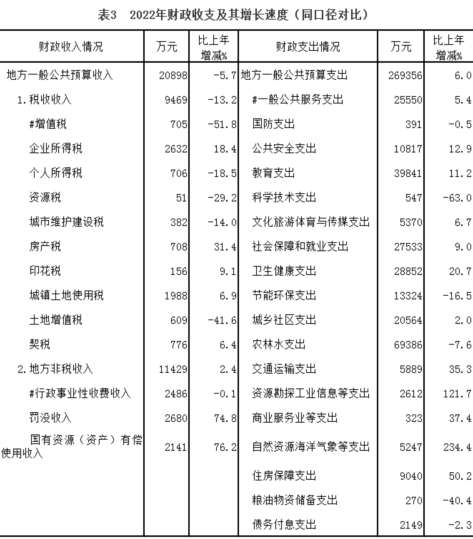2022年,全市一般公共預(yù)算收入20898萬元,同口徑下降5.7%。其中,稅收收入9469萬元,同口徑下降13.2%,非稅收收入11429萬元,同比增長2.4%。一般公共預(yù)算支出269356萬元,同比增長6.0%。
