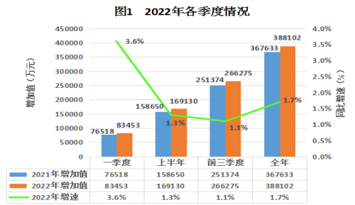 初步核算,2022年全市地區(qū)生產(chǎn)總值完成388102萬元,按不變價(jià)格計(jì)算,同比增長1.7%。其中,第一產(chǎn)業(yè)增加值83659萬元,同比增長3.0%;第二產(chǎn)業(yè)增加值65495萬元,同比增長1.4%;第三產(chǎn)業(yè)增加值238948萬元,同比增長1.3%。三次產(chǎn)業(yè)結(jié)構(gòu)調(diào)整為21.5:16.9:61.6。全年人均地區(qū)生產(chǎn)總值34761元。