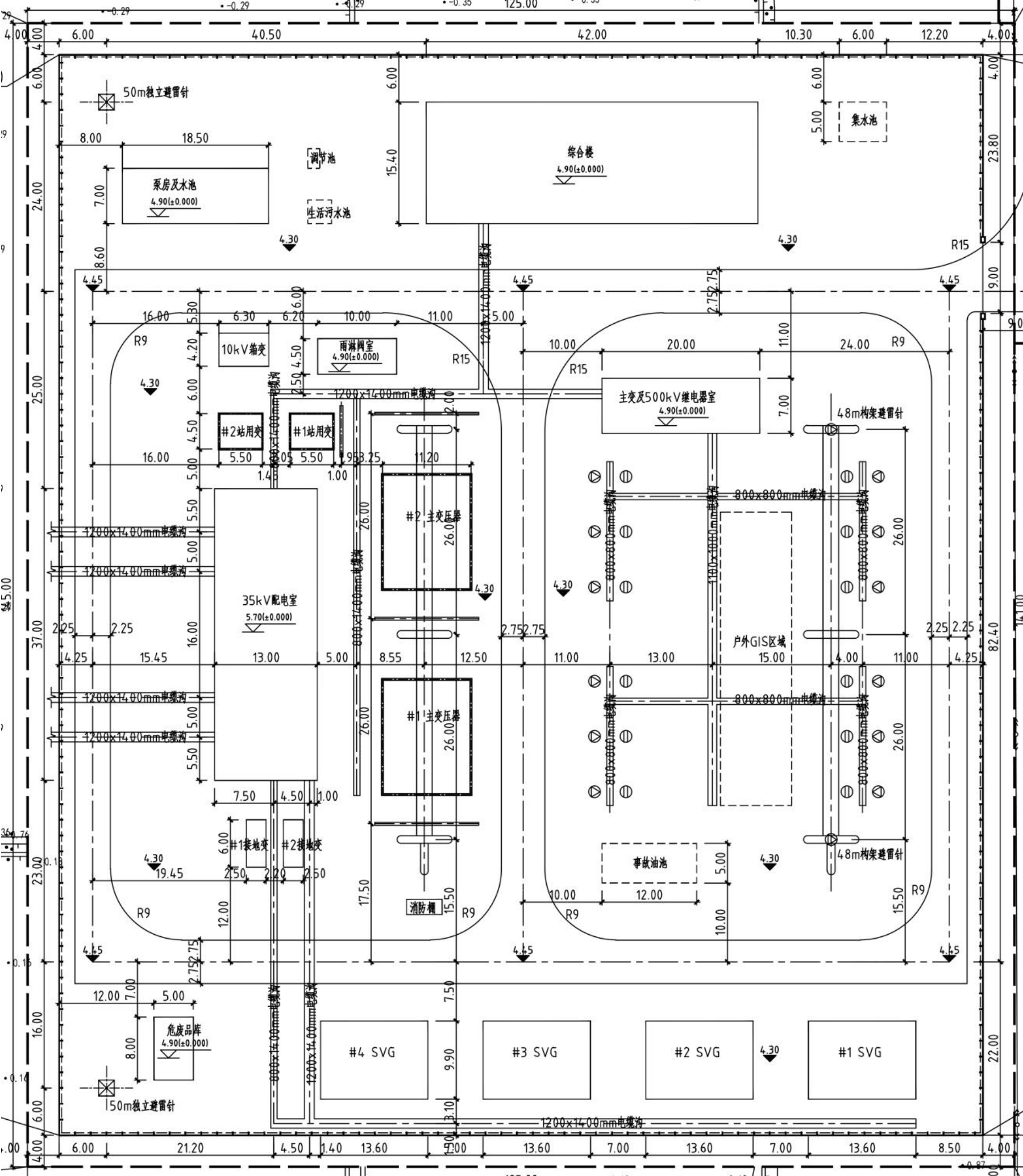 站區(qū)總平面規(guī)劃布置按4 個功能分區(qū),采用三列式布置格局:500kV 配電布置在站區(qū)東側(cè),采用GIS 設(shè)備,向東出線;主變壓器及35kV 配電裝置布置在站區(qū)西部,向西出線;綜合樓布置在站區(qū)北部附近,大門口在東側(cè);SVG 布置在站區(qū)南側(cè)。500kV 配電裝置區(qū)、主變壓器及35kV 配電室設(shè)置環(huán)形道路。