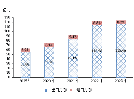 全年進(jìn)出口總額123.75億元,比上年增長1.3%。其中,進(jìn)口8.29億元,下降3.8%;出口115.46億元,增長1.7%。