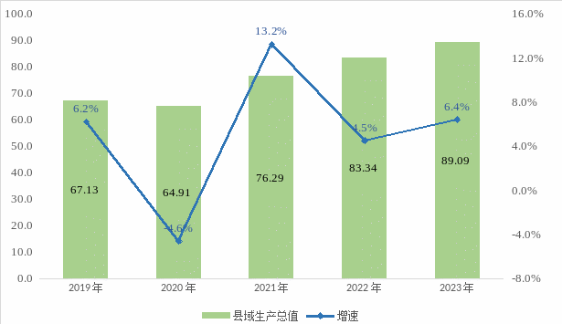 初步核算,全縣完成地區(qū)生產(chǎn)總值89.09億元,按不變價計算,同比增長6.4%。其中:第一產(chǎn)業(yè)增加值21.38億元,同比增長5.1%;第二產(chǎn)業(yè)增加值16.22億元,同比增長6.3%;第三產(chǎn)業(yè)增加值51.49億元,同比增長6.9%。三次產(chǎn)業(yè)結(jié)構(gòu)由2022年的23.2:20.4:56.4調(diào)整為24.0:18.2:57.8,第一產(chǎn)業(yè)占比上升0.8個百分點,第二產(chǎn)業(yè)占比下降2.2個百分點,第三產(chǎn)業(yè)占比上升1.4個百分點。全縣人均地區(qū)生產(chǎn)總值51084元。