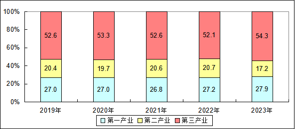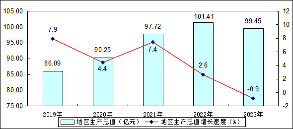 2023年全縣地區(qū)生產(chǎn)總值99.45億元,比上年下降0.9%,經(jīng)濟(jì)總量排全州第9位。分產(chǎn)業(yè)看,第一產(chǎn)業(yè)增加值27.93億元,增長3.8%;第二產(chǎn)業(yè)增加值17.24億元,下降17.3%;第三產(chǎn)業(yè)增加值54.28億元,增長3.2%。第一產(chǎn)業(yè)、第二產(chǎn)業(yè)、第三產(chǎn)業(yè)增加值占生產(chǎn)總值的比重分別為28.08%、17.34%和54.58%。與上年相比,第一產(chǎn)業(yè)占生產(chǎn)總值的比重較上年上升了0.9個(gè)百分點(diǎn),第二產(chǎn)業(yè)增加值占生產(chǎn)總值的比重下降了3.38個(gè)百分點(diǎn),第三產(chǎn)業(yè)增加值占生產(chǎn)總值的比重下降了2.5個(gè)百分點(diǎn)。全縣人均地區(qū)生產(chǎn)總值為42895元,比上年減少930元。