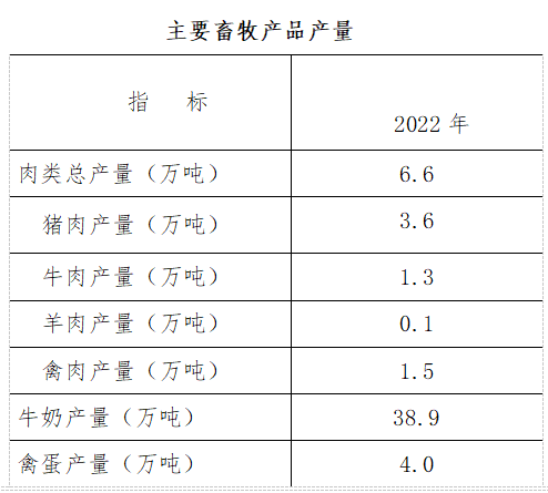 豬、牛、羊、家禽存欄分別為 26.9 萬頭、15.2 萬頭、6.9萬頭、552.6萬只,分別下降16.7%、增長3.2%、下降10.3%、下降 7.2%。肉、蛋、牛奶產(chǎn)量分別為6.4萬噸、3.8 萬噸、40.1萬噸,分別下降2.3%、下降4.9%、增長3.3%。