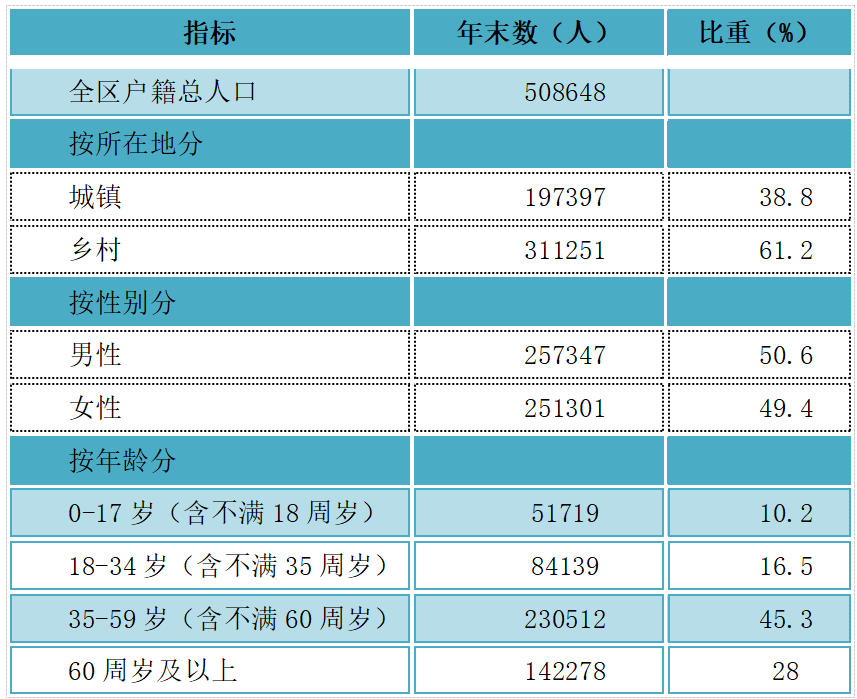 年末戶籍總?cè)丝?08648人。其中,城鎮(zhèn)人口197397人,戶籍人口城鎮(zhèn)化率38.8%。在全區(qū)人口中,60歲以上老年人口142278人,占總?cè)丝诘谋戎貫?8%。全區(qū)出生人口1539人,出生率3‰,死亡人口2573人,死亡率5.1‰。全區(qū)人口自然增長率為-2‰。