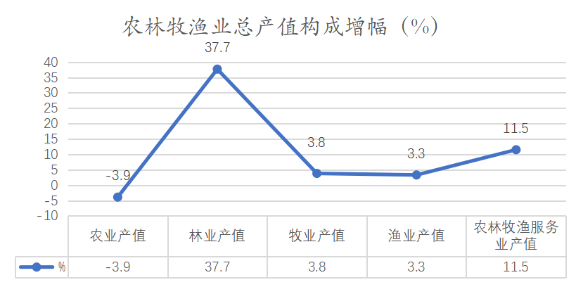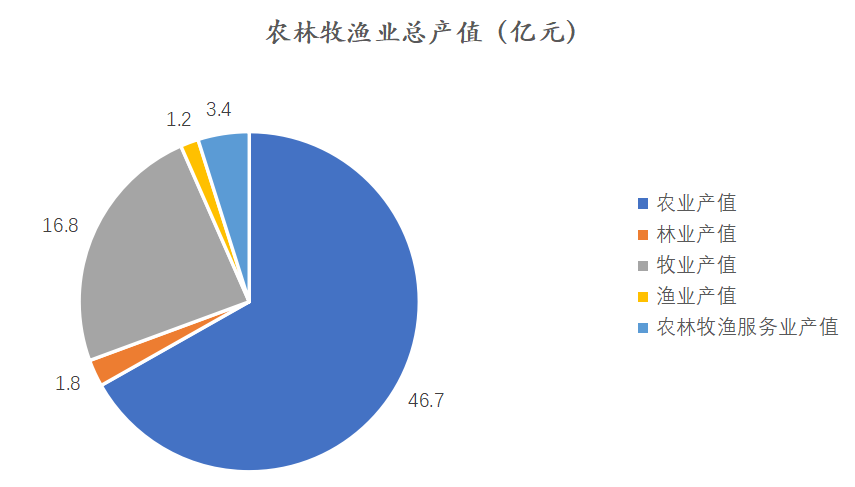 全年完成農(nóng)林牧漁業(yè)總產(chǎn)值69.9億元,比上年下降0.8%。其中農(nóng)業(yè)產(chǎn)值46.7億元,比上年下降3.9%;林業(yè)產(chǎn)值1.8億元,比上年增長37.7%;牧業(yè)產(chǎn)值16.8億元,比上年增長3.8%;漁業(yè)產(chǎn)值1.2億元,比上年增長3.3%;農(nóng)林牧漁服務(wù)業(yè)產(chǎn)值3.4億元,比上年增長11.5%。